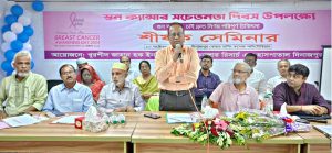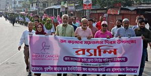 আজ বৃহস্পতিবার (১০ অক্টোবর) উপশহরস্থ খুরশিদ জাহান হক ইনস্টিটিউট অব ক্যান্সার রিসার্চ এন্ড হাসপাতাল চত্বর থেকে সকাল সাড়ে ৮টায় খুরশিদ জাহান হক ইনস্টিটিউট অব ক্যান্সার রিসার্চ এন্ড হাসপাতাল এর সাধারণ সম্পাদক মো. আনোয়ারুল কবির এর নেতৃত্বে বর্ণাঢ্য শোভাযাত্রা বের হয়ে শহরের প্রধান প্রধান সড়ক প্রদক্ষিন শেষে উপ শহরস্থ দিনাজপুর কেয়ার নার্সিং কলেজ অডিটোরিয়ামে সেমিনারে মিলিত হয়। সকাল সাড়ে ৯টায় কেয়ার নার্সিং কলেজ অডিটোরিয়ামে “স্তন ক্যান্সার চাই দ্রæত নির্ণয় পরিপূর্ণ চিকিৎসা” প্রতিপাদ্যকে সামনে রেখে সেমিনার অনুষ্ঠিত হয়।