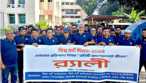 এর আগে সকাল সাড়ে আটটায় জিয়া হার্ট ফাউন্ডেশনের কোষাধ্যক্ষ মোঃ আনোয়ারুল কবির এর নেতৃত্বে বিশ্ব হার্ট দিবসের একটি বর্ণাঢ্য র্যালী বের হয়ে শহরের প্রধান প্রধান সড়ক সমূহ প্রদক্ষিণ করে। র্যালীতে অংশ গ্রহণ করেন জিয়াহার্ট ফাউন্ডেশনের যুগ্ম সম্পাদক মো. আবু তাহের আবু, ডা. মো. জিয়াউল হক, আইন উপদেষ্টা এডভোকেট মোল্লা মো. সাখাওয়াত হোসেন, আজীবন সদস্য গোলাম রসুল রকেট,প্রধান নির্বাহী কর্মকর্তা সৈয়দ মেজবাহ আলম, খুরশিদ জাহান জাহান হক ক্যান্সার হাসপাতালের সদস্য শওকতুল্লাহ মজিদ, হাসপাতাল ম্যানেজার এএসএম আক্তার শামীম, পাবলিক রিলেশন এন্ড এ্যাসাইনমেন্ট অফিসার সৈয়দ শফিকুর রহমান পিন্টু, মার্কেটিং ম্যানেজার মো. রুকুনুজ্জামান, ম্যানেজার বিজনেস ডেভলপমেন্ট এ কে এম মো. রকুনুজ্জামান, কেয়ার স্পেশালাইজড জেনারেল হাসপাতালের প্রশাসনিক কর্মকর্তা (কিডনি বিভাগ) আবু রেজা মো. শামীম খাঁন প্রমুখ।